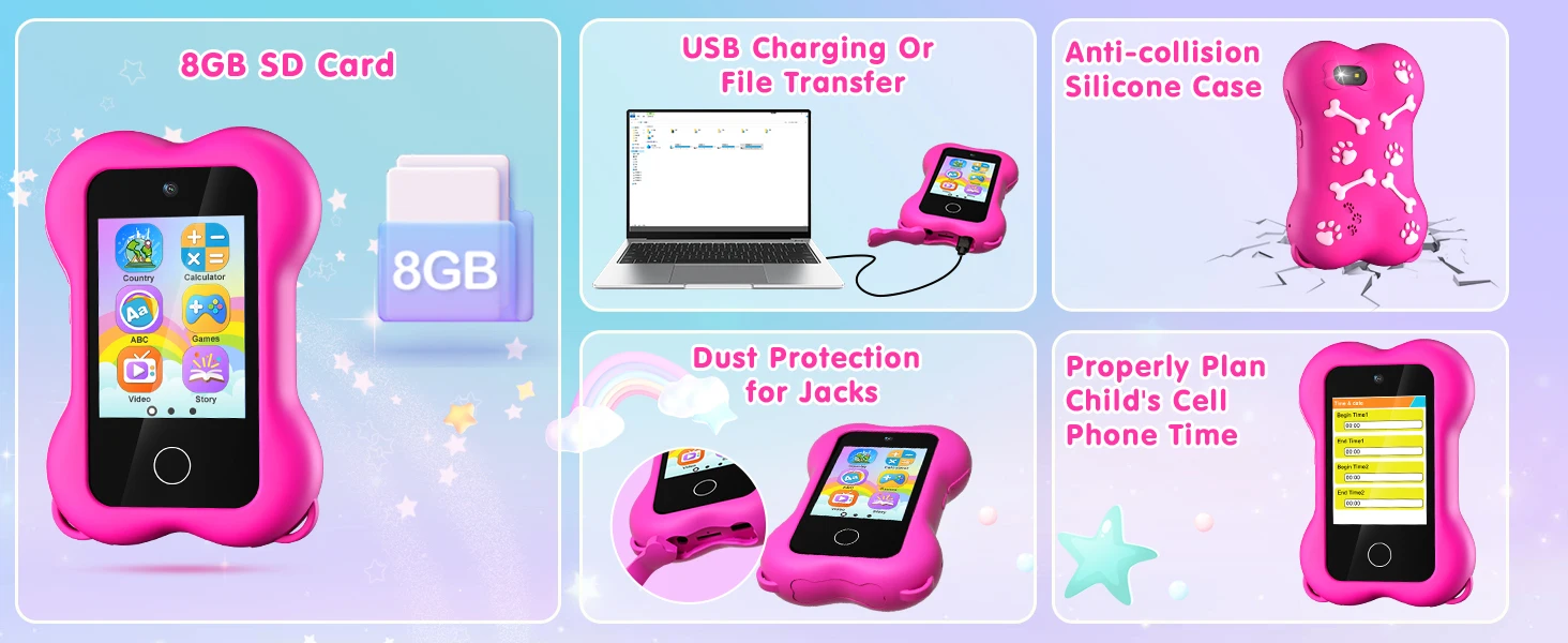 【Cute and Fun Smart Phone for Kids】This adorable dog bone smartphone features a 2.8" touchscreen display, dual cameras, and big head stickers that make taking selfies more exciting for kids. With its high-quality speaker and 3.5mm headphone jack, kids can also enjoy music and share photos with family and friends